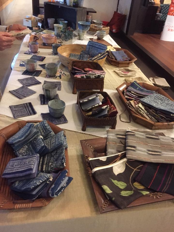 手前の左側はモン族の藍染バティック布のカードケースです。近日掲載予定です。