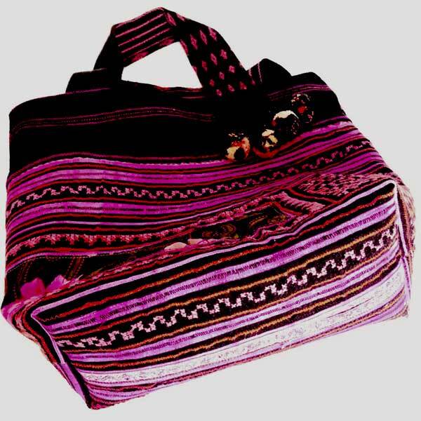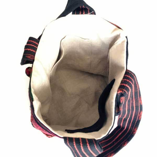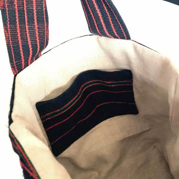 タイの山岳民族の古布をリメイクして本体部分にはモン族の刺繍布と山岳民族のストライプのヘンプの布を 組み合わせ